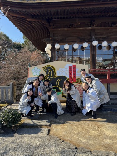 最後に通りがかりの方にお願いして、全員で巨大絵馬の前での記念撮影にて解散。